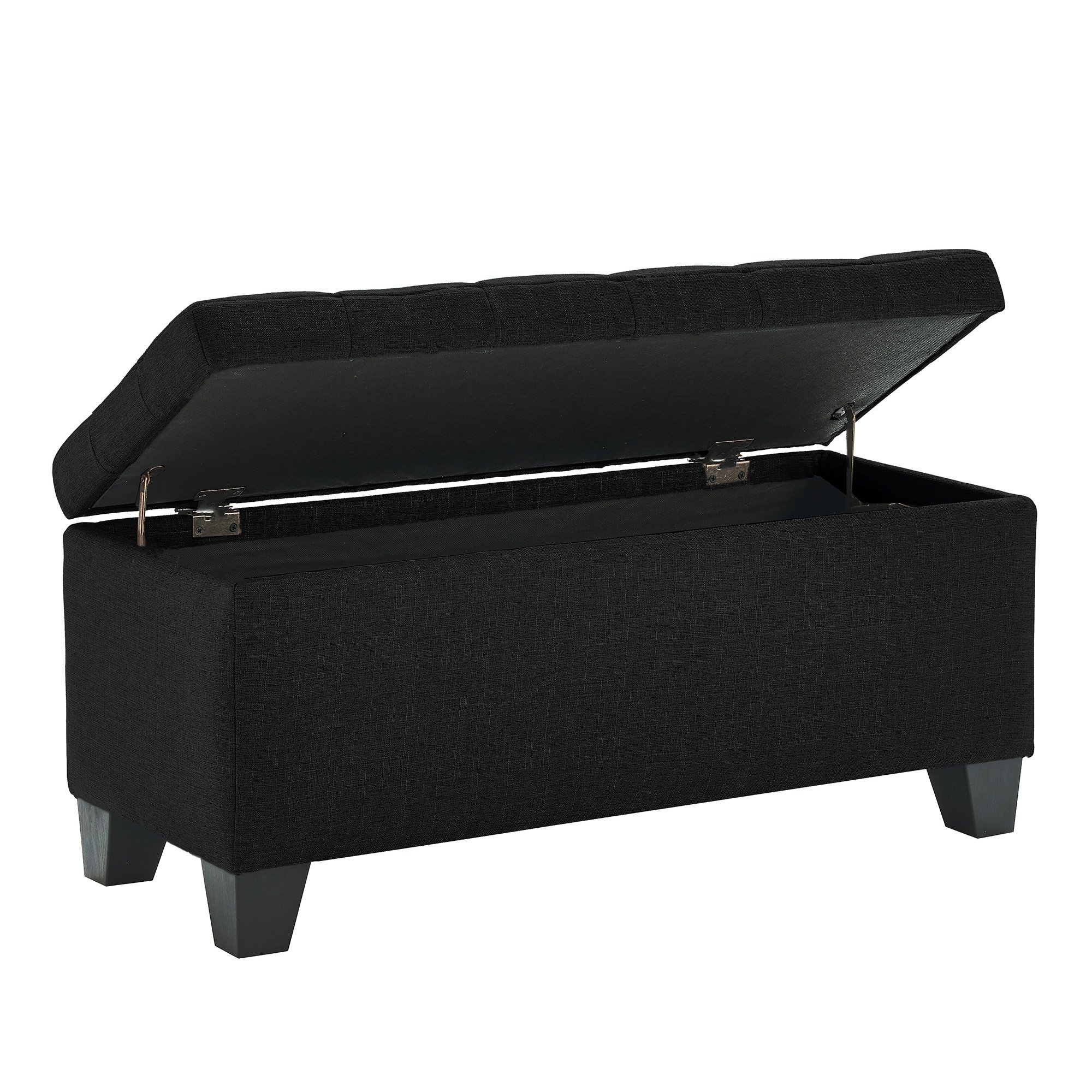 Items you keep in this ultra-deep storage ottoman may be out of sight and out of mind, but this piece can stay front and centre! A perfect add-in to any space for extra seating when needed and extra storage always available. The tufted, upholstered design will work well in any space. Safety-stop hinges keep fingers safe by preventing any accidental slamming of the seat. Sturdy black legs provide stability and support in this versatile piece.